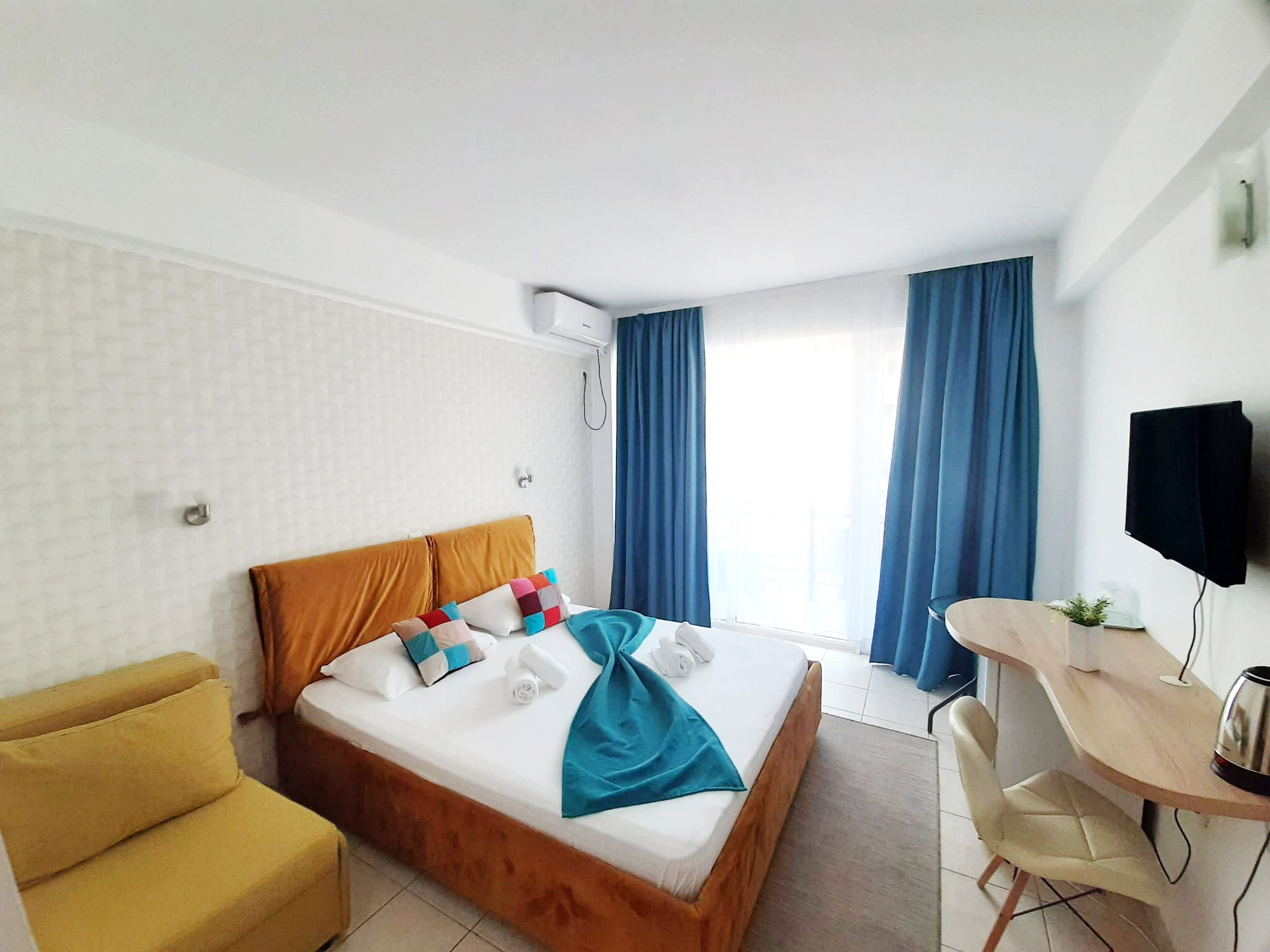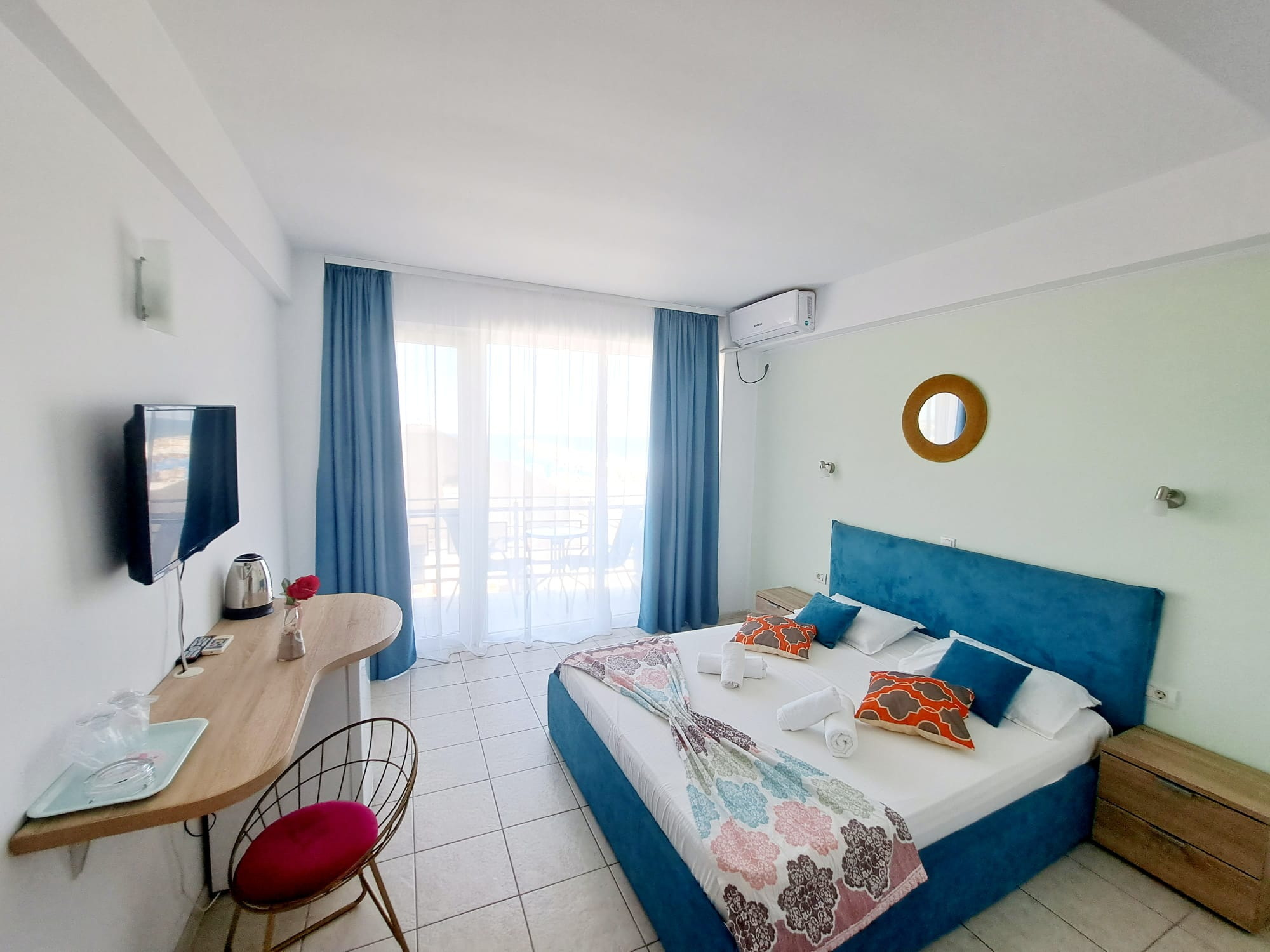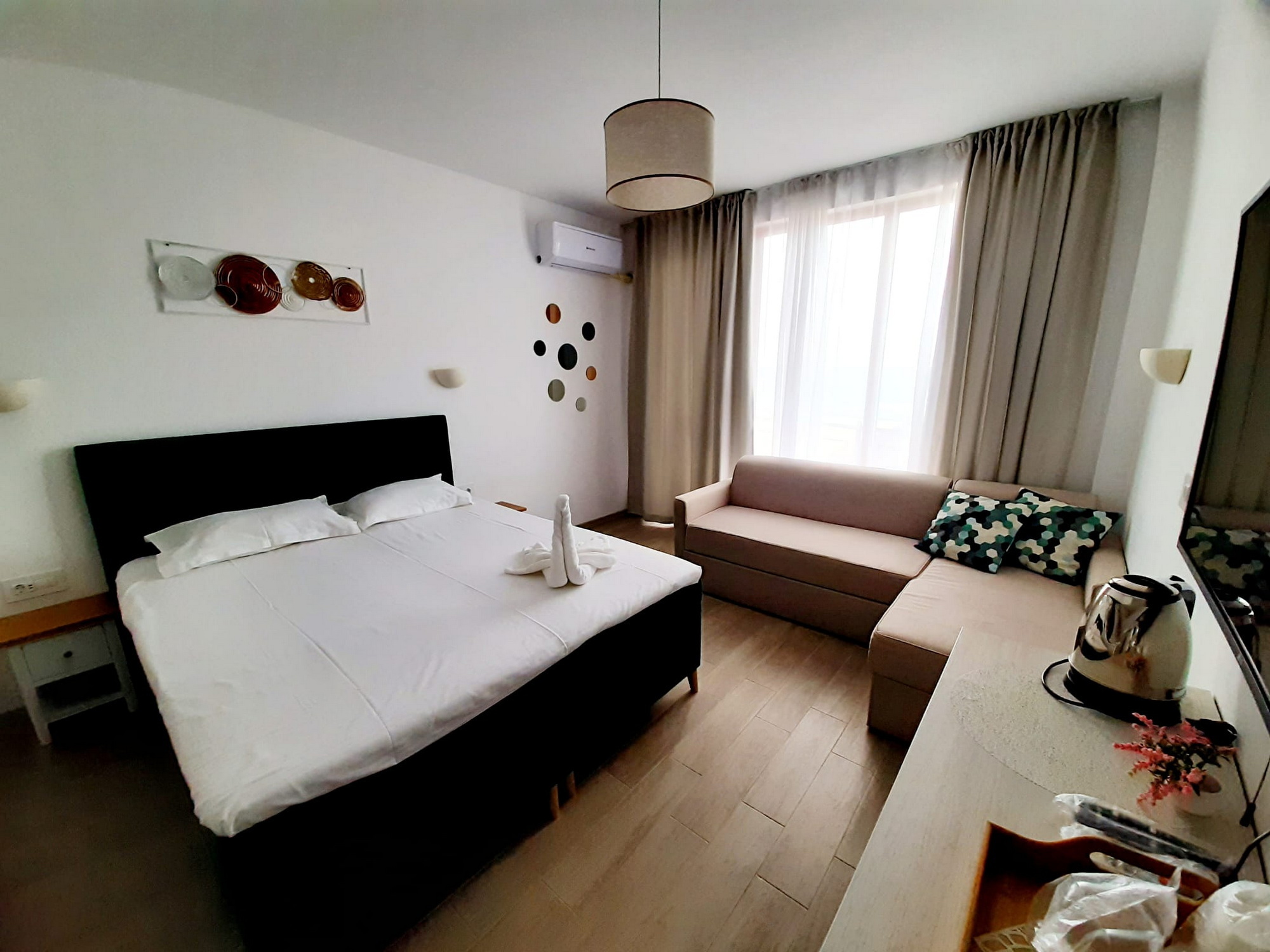 Camerele sunt spațioase, luminoase și dotate cu balcon, oferindu-ți vedere spre mare sau lac. Ai parte de confort modern, curățenie zilnică și un spațiu în care te poți relaxa cu adevărat după fiecare zi petrecută la plajă.